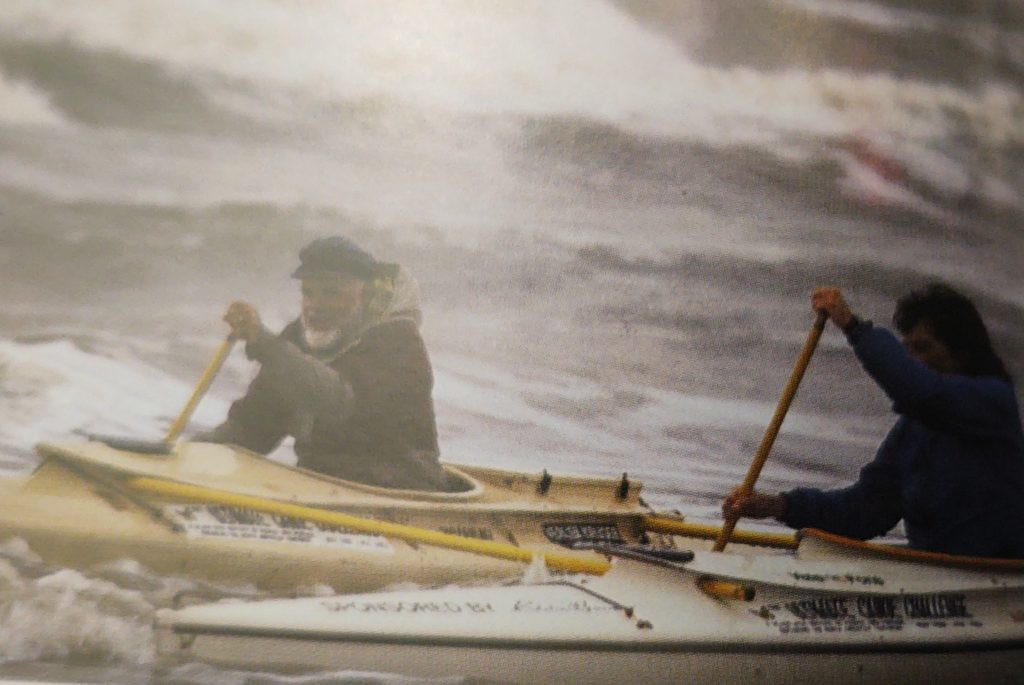 Then the Coast Guard arrived. In attempting to get themselves and their boats aboard the "cutter," Verlen in the catamaranned canoes was let loose inadvertently after he'd handed his paddle to the Coast Guard. Valerie wrote, "There was Verlen floating in the lake on the swells with no paddle to control his movement, or turn the bows into the waves. The expression on his face was a grimace of hopelessness.