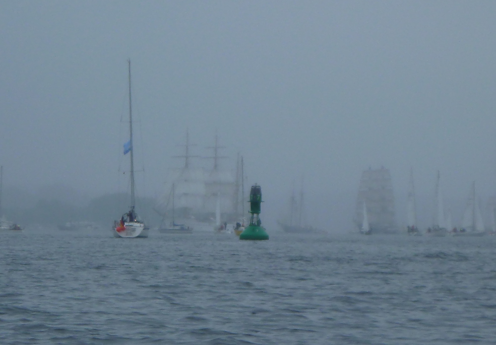 Der Nebel verdichtete sich auf dem Segel zu Tropfen, rann hinunter, lief am Unterliek ab. Es wehte ein schwacher West. Ich behielt den Verkehr an der Fahrwassertonne im Auge und beobachtete, wie sich Segeltürme langsam aus dem grauen Dunst lösten und auf mich zudrifteten, die Schiffe der Windjammerparade, übriggebliebene Relikte eines vergangenen Zeitalters.